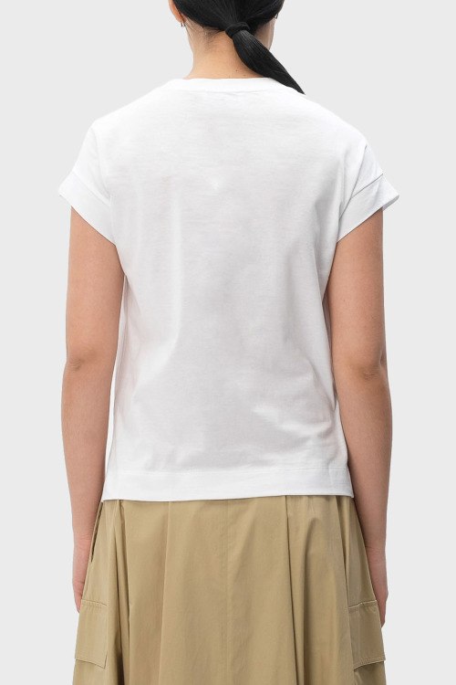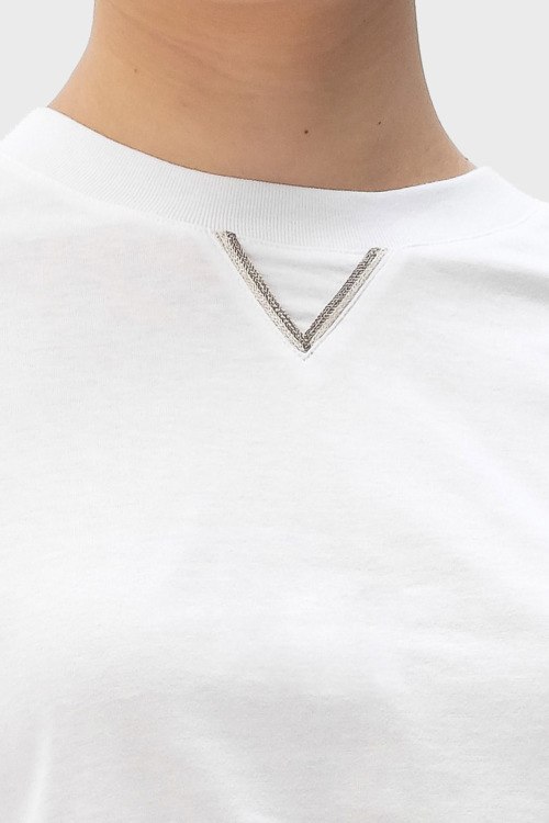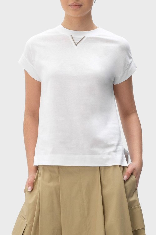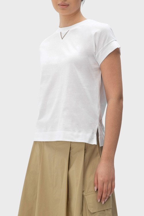 Детали: Женская белая футболка из хлопка от Tonet (Тонет). Классическая длина, круглый вырез горловины с декоративной вставкой, короткие рукава, по бокам разрезы