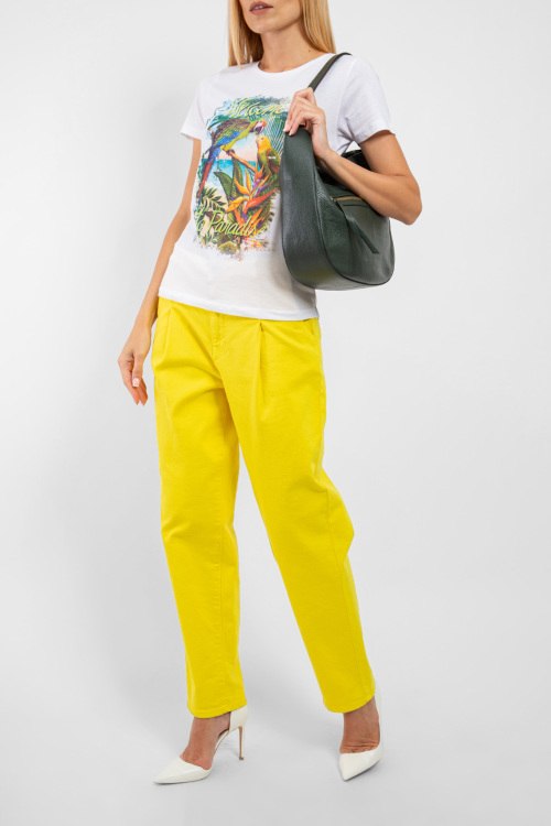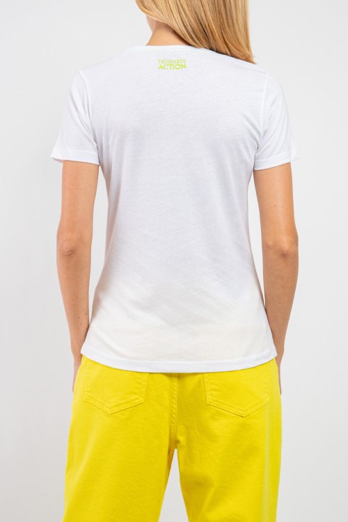 Женская белая хлопковая футболка от Trussardi (Труссарди). Яркий принт спереди, круглый вырез горловины, короткий рукав, классическая длина.