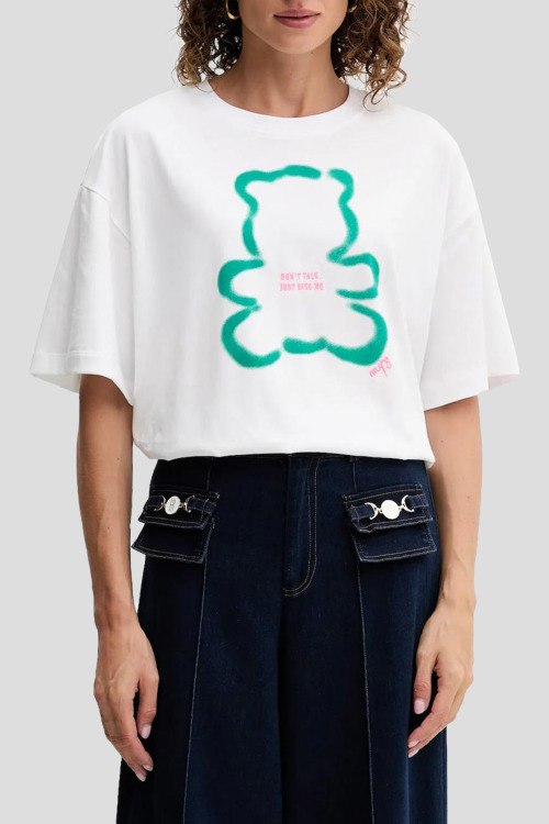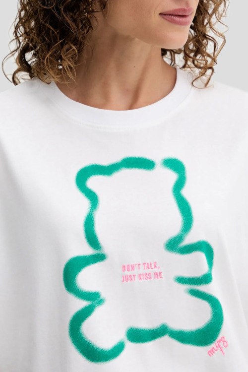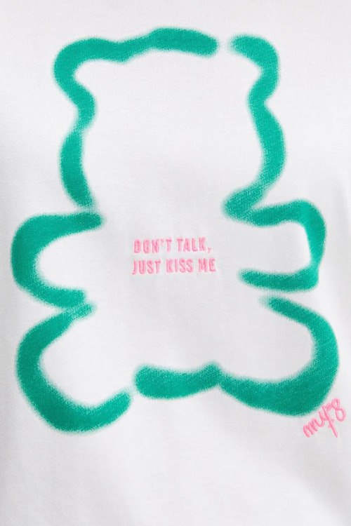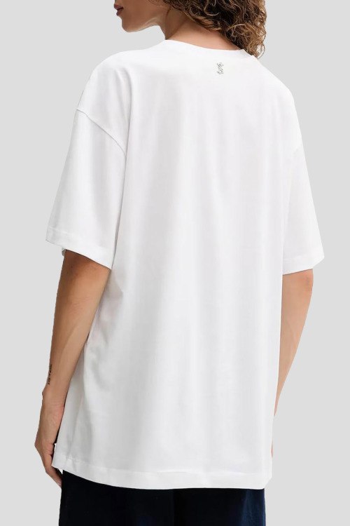 Детали: Женская белая хлопковая футболка от художника Myfo от TWINSET (Твинсет). Фасон oversize, принт на груди, круглый вырез горловины, короткий рукав, удлиненная длина