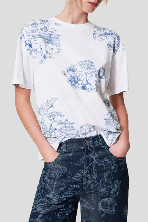 Детали: Женская белая хлопковая футболка Myfo от TWINSET (Твинсет). Графический принт, круглый вырез горловины, короткий рукав, классическая длина