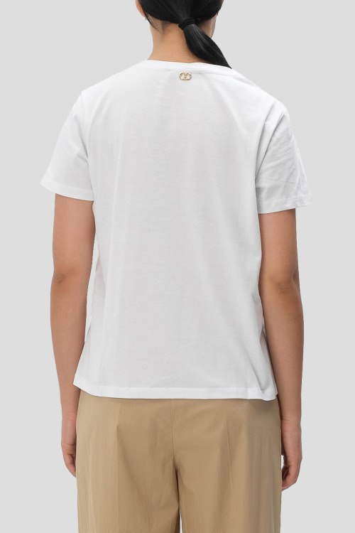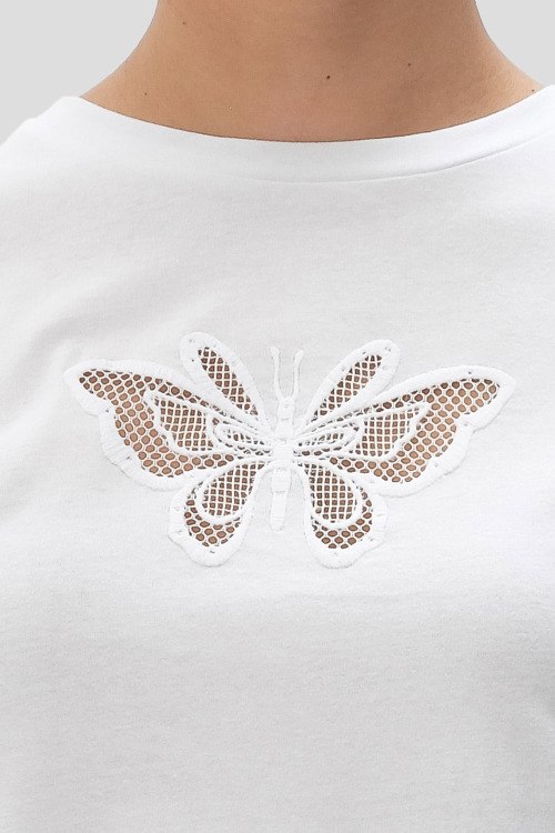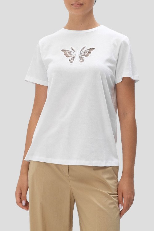 Детали: Женская белая хлопковая футболка от TWINSET (Твинсет). Вышивка в ввиде бабочки на груди, круглый вырез горловины, короткий рукав, классическая длина
