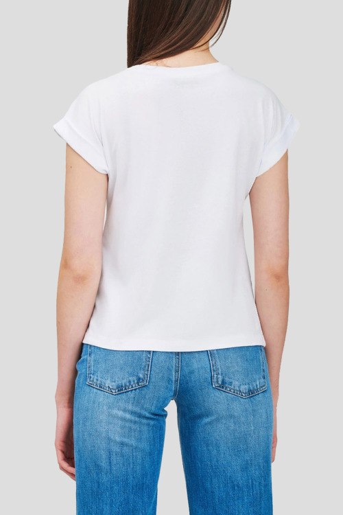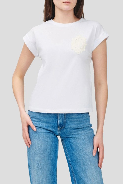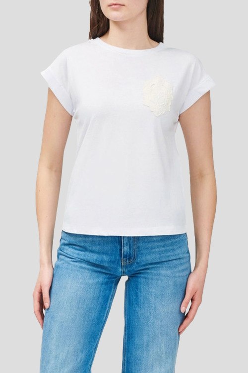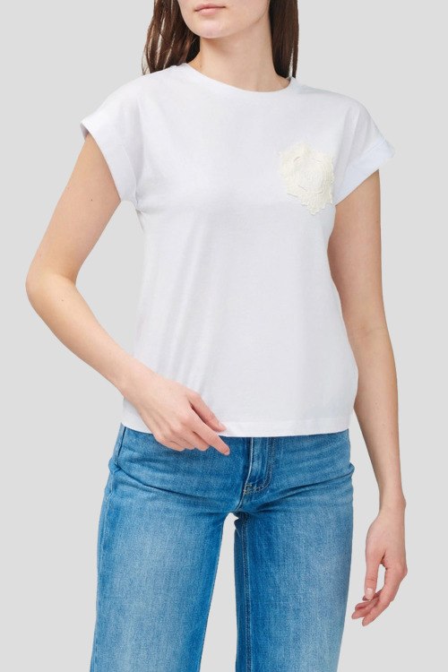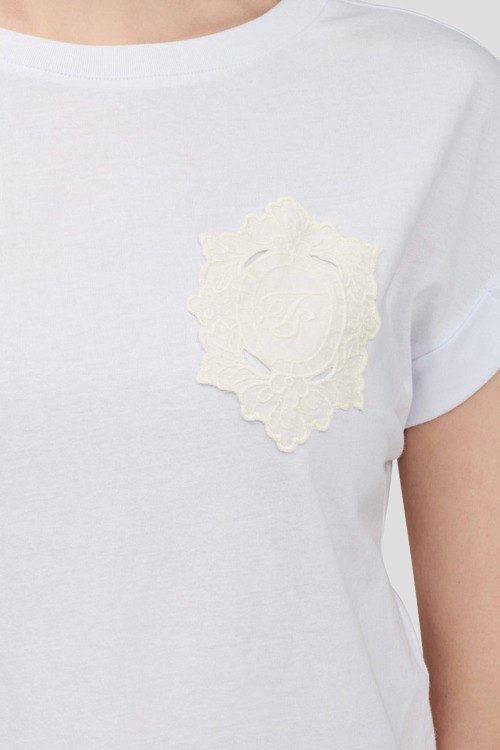 Детали: Женская белая футболка из хлопка от TWINSET (Твинсет). Классическая длина, круглый вырез горловины, короткие рукава, модель декорирована кружевом на груди