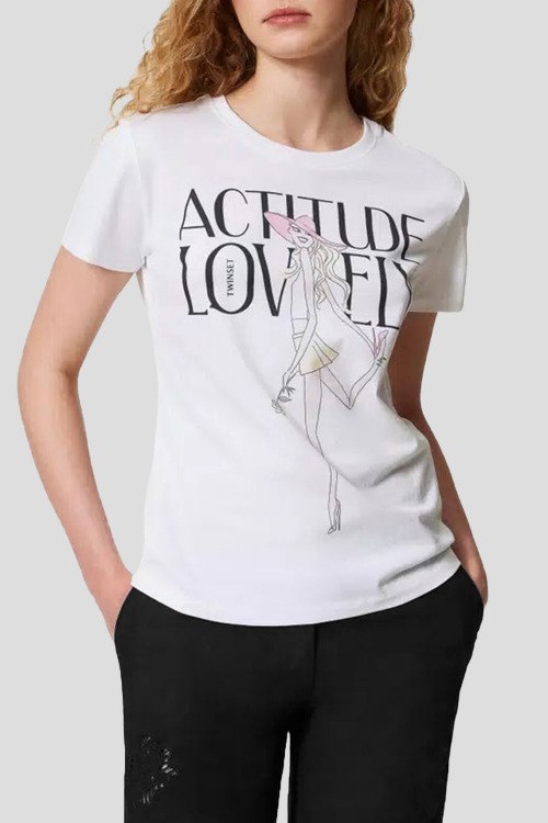 Детали: Женская белая футболка из хлопка от TWINSET (Твинсет). Классическая длина, круглый вырез горловины, короткие рукава, принт на груди