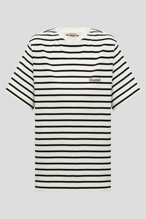 Детали: Женская черно-белая футболка из хлопка от Woolrich (Вулрич). Дизайн в полоску, круглый вырез горловины, короткие рукава, логотип бренда. Замеры: длина рукава: короткий, для размера S – 20 см, обхват груди: для размера S – 100 см, обхват талии: для размера S – 96 см, длина изделия по среднему шву спинки от горловины: для размера S – 57 см