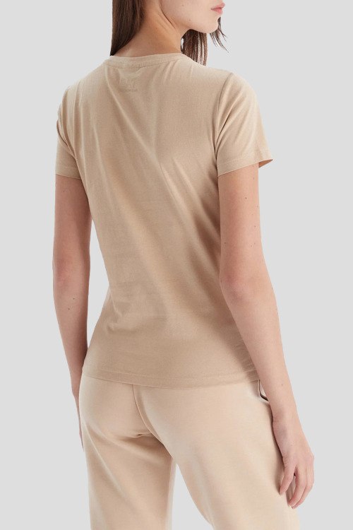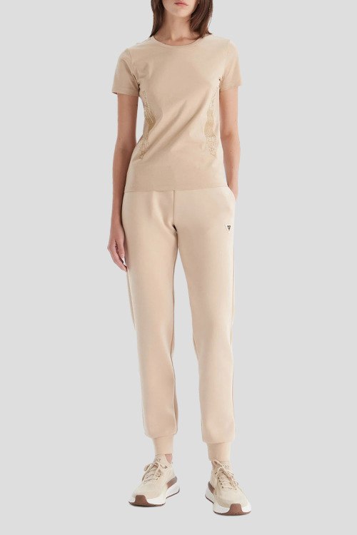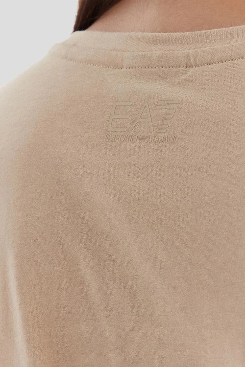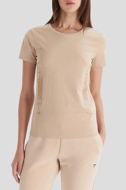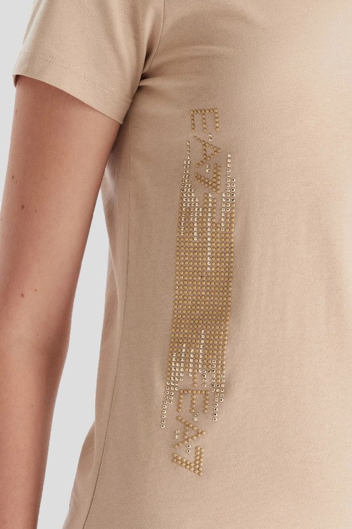 Детали: Женская бежевая хлопковая футболка от EA7 Emporio Armani (ЕА7 Эмпорио Армани). Декор кристаллами по бокам, круглый вырез горловины, короткий рукав, классическая длина