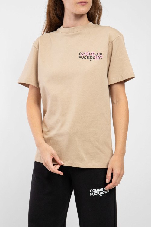 Женская бежевая хлопковая футболка от Comme des Fuckdown (Камм дес Факдаун). Принт с логотипом спереди и сзади, круглый вырез горловины, короткий рукав, классическая длина.