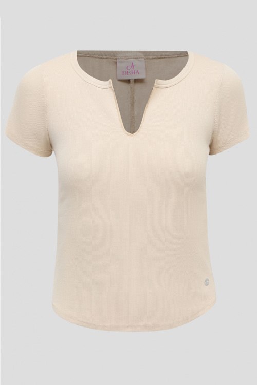Детали: Женская бежевая хлопковая футболка от Deha (Деха). V-образный вырез, короткий рукав, классическая длина. Длина рукава: короткий, для размера S - 14 см, обхват груди: для размера S - 80 см, обхват талии: для размера S - 70 см, длина изделия по среднему шву спинки от горловины: для размера S - 51,5 см