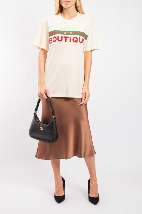 Женская светло-бежевая хлопковая футболка Gucci Boutique от Gucci (Гуччи). Фасон oversize, логотип на груди, круглый вырез горловины, короткий рукав, удлиненная длина.