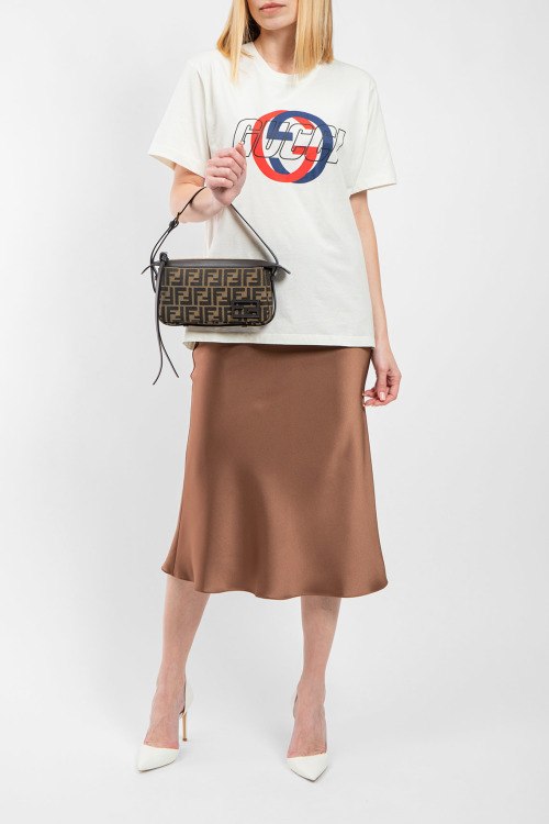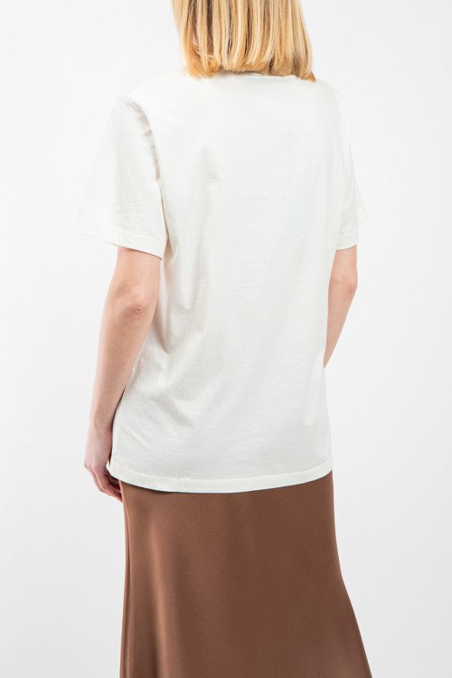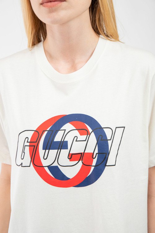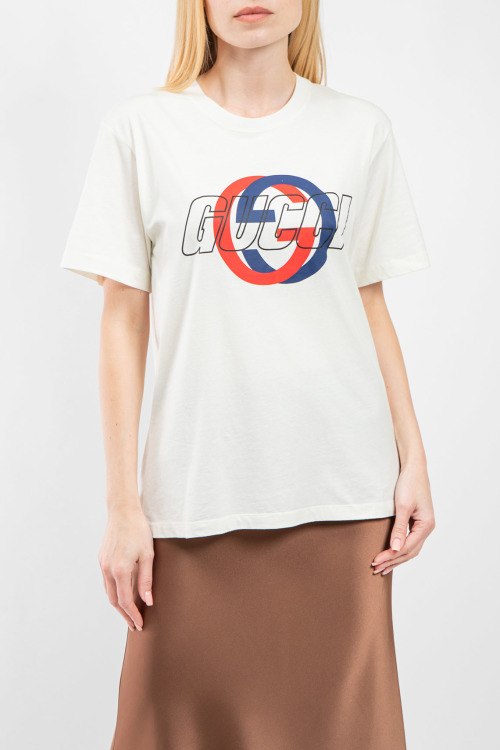 Женская бежевая футболка из хлопка от Gucci (Гуччи). Фасон oversize, круглый вырез горловины, короткие рукава, брендированный принт на груди. Замеры для размера на фото: M; длина - 65 см; ПОГ - 52 см; ПОТ - 51,5 см; ПОБ - 51,5 см; длина по внутреннему шву рукава - 11 см; ширина рукава - 22 см.