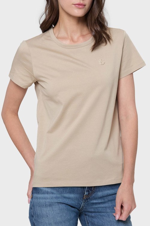 Детали: Женская бежевая хлопковая футболка Eventsa8 от Hugo Boss (Хуго Босс). Логотип на груди, круглый вырез горловины, короткий рукав, классическая длина