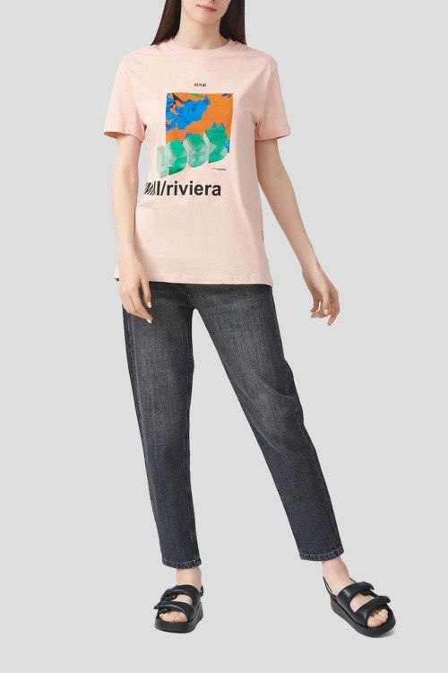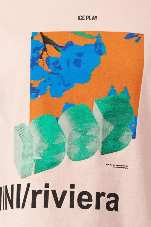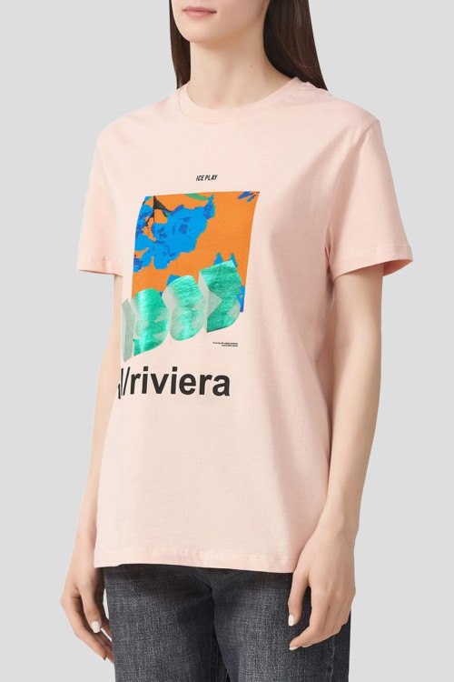 Детали: Женская бежевая футболка из хлопка от Ice Play (Айс Плей). Классическая длина, круглый вырез горловины, короткие рукава, принт на груди