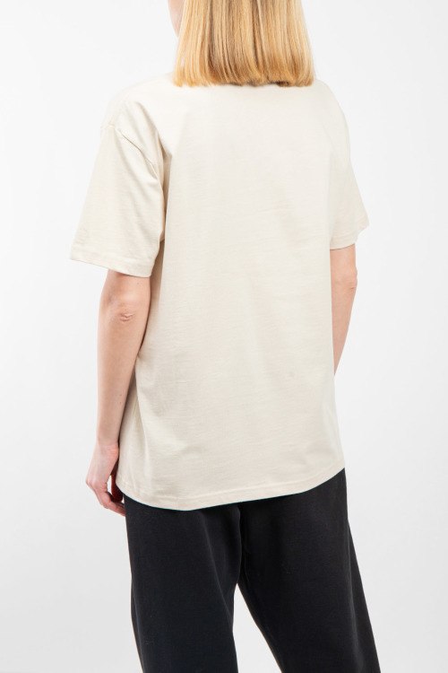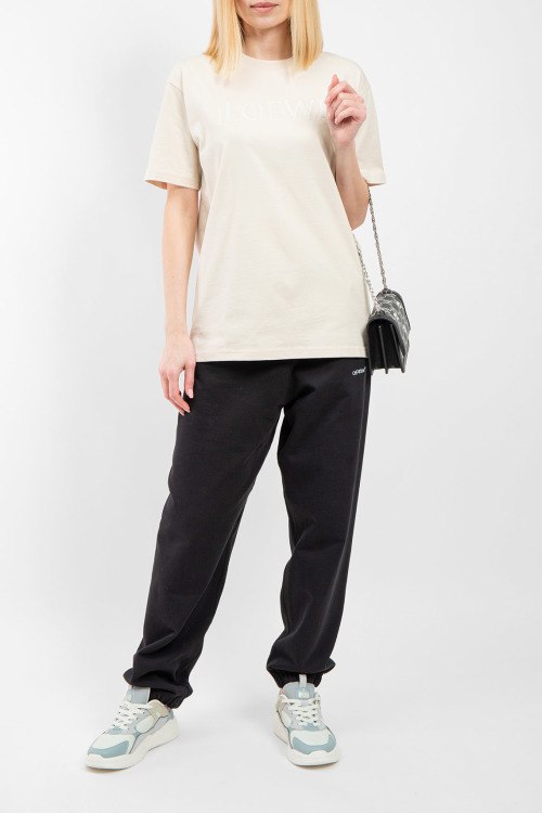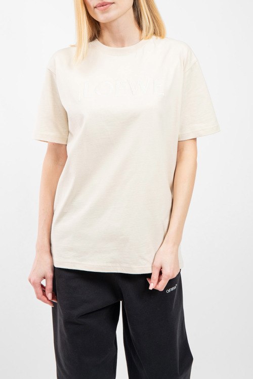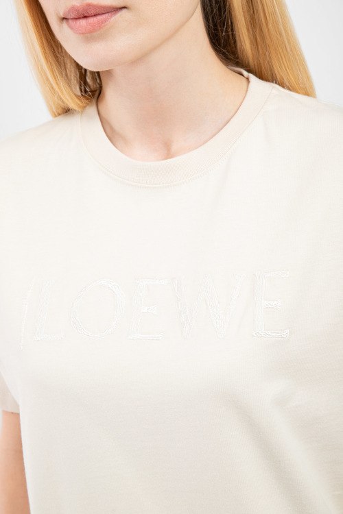 Женская светло-бежевая хлопковая футболка от Loewe (Лоэйве). Принт с логотипом на груди, круглый вырез горловины, короткий рукав, удлиненная длина.