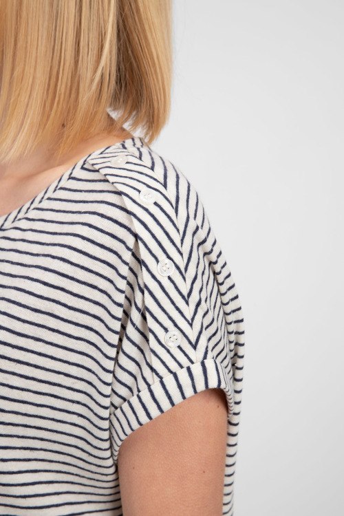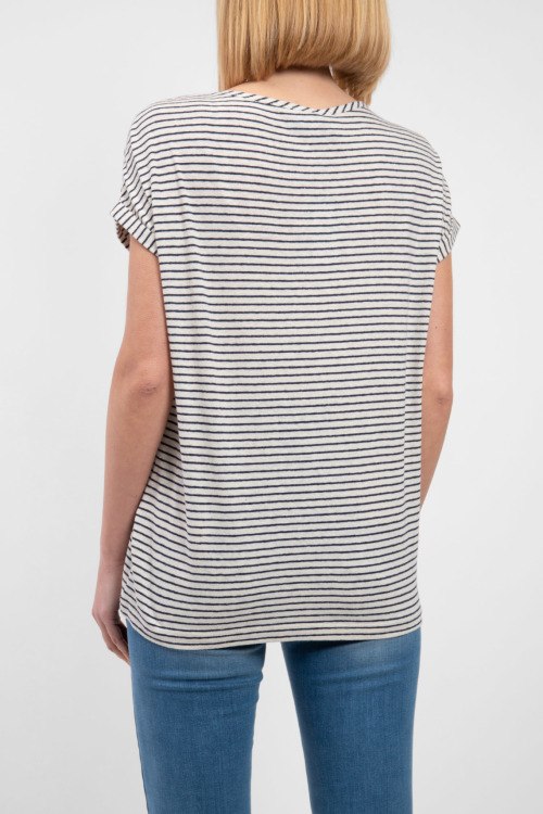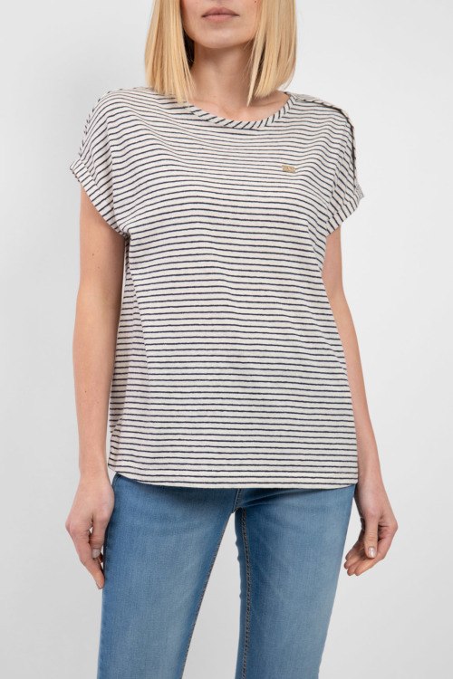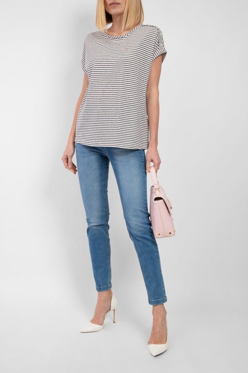 Женская бежевая футболка из хлопка и льня от EA7 Emporio Armani (ЕА7 Эмпорио Армани). Дизайн в мелкую полоску, круглый вырез горловины, короткие цельнокроеные рукава, патч-лого на груди.
