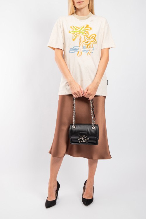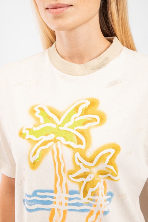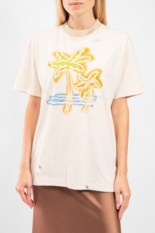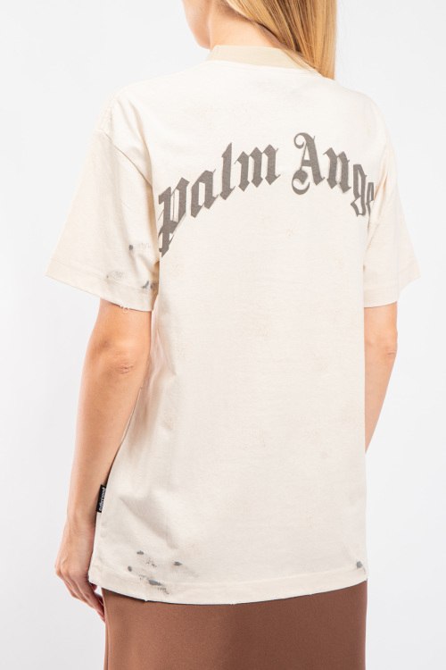 Женская светло-бежевая хлопковая футболка от Palm Angels (Палм Энджелс). Графический принт спереди и сзади, круглый вырез горловины, короткий рукав, удлиненная длина.