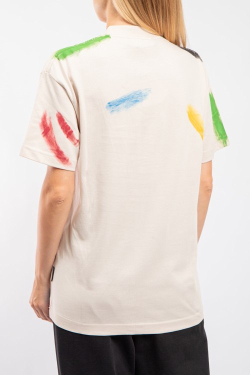 Женская светло-бежевая хлопковая футболка от Palm Angels (Палм Энджелс). Фасон oversize, графический принт, круглый вырез горловины, короткий рукав, удлиненная длина.
