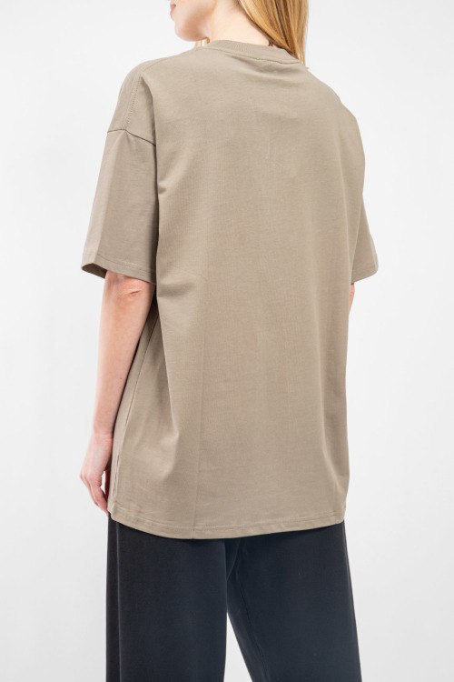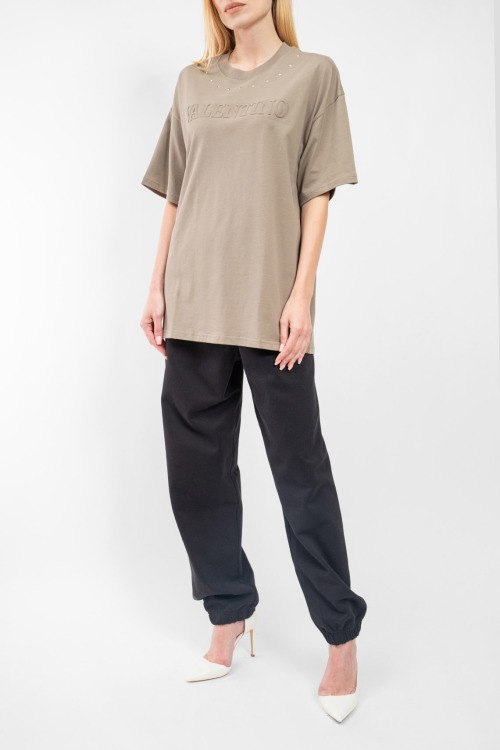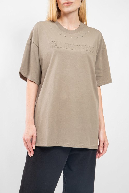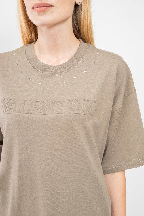 Женская бежевая футболка из хлопка от Valentino (Валентино). Модель oversize, круглый вырез горловины, короткие рукава, фактурный логотип бренда на груди.
