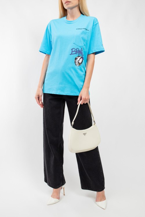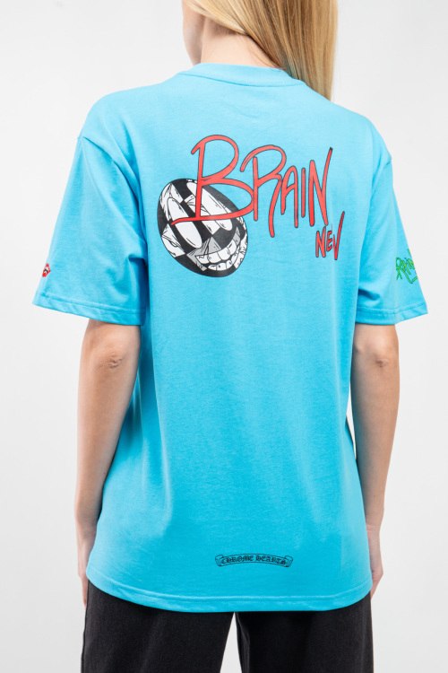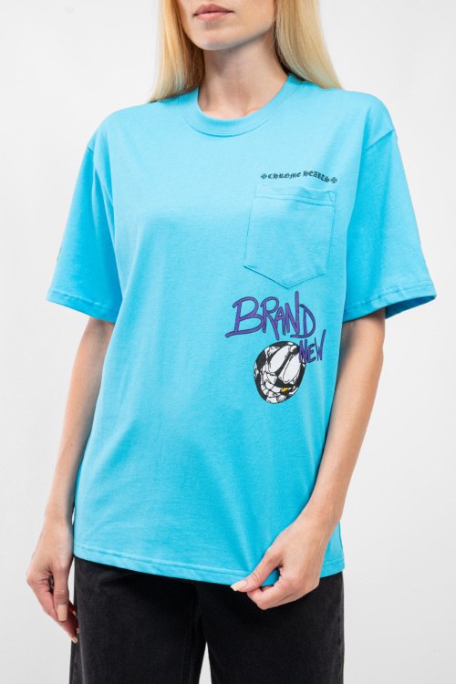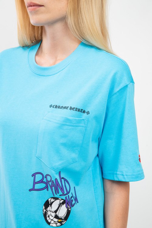 Женская бирюзовая хлопковая футболка от Chrome Hearts (Хром Хартс). Карман на груди, принт спереди и сзади, круглый вырез горловины, короткий рукав, удлиненная длина.