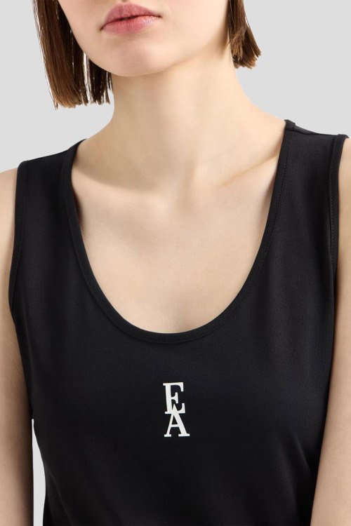 Детали: Женская черная хлопковая майка от Emporio Armani (Эмпорио Армани). Модель без рукавов, круглый вырез, логотип на груди, классическая длина
