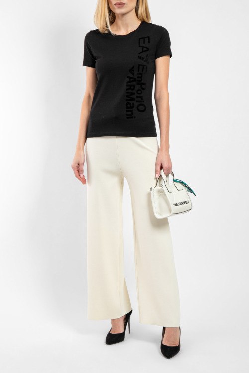 Женская черная футболка из хлопкового микса от EA7 Emporio Armani (ЕА7 Эмпорио Армани). Круглый вырез горловины, короткие рукава, логотип бренда, классическая длина.
