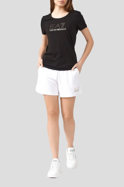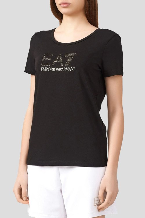Детали: Женская черная футболка из хлопкового микса от Armani (Армани). Круглый вырез горловины, короткие рукава, брендированный принт с кристаллами
