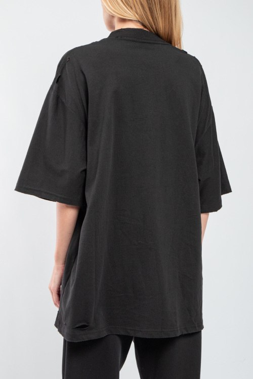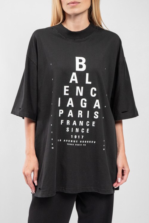Детали: Женская черная хлопковая футболка Optical от Balenciaga (Баленсиага). Модель oversize, принт с логотипом, дизайн с рваными деталями, круглый вырез горловины, короткий рукав, удлиненная длина