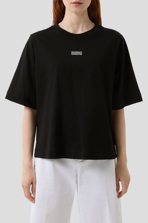 Детали: Женская черная футболка Dorothy из хлопка от Bogner (Богнер). Круглый вырез горловины, короткие рукава, брендированный принт на груди, свободный силуэт