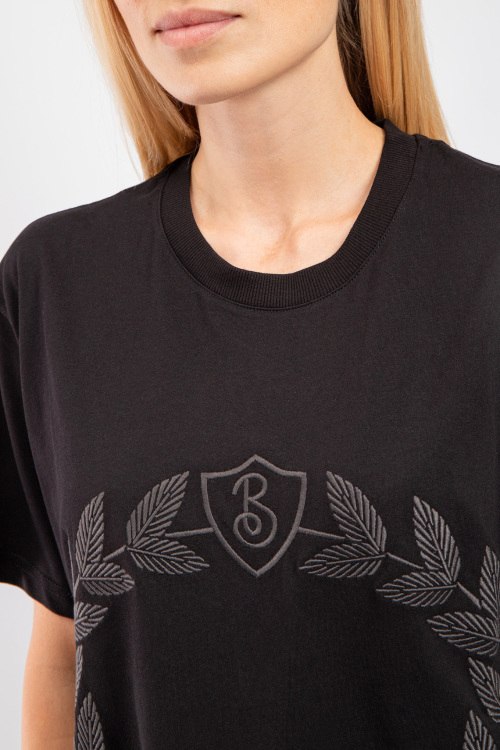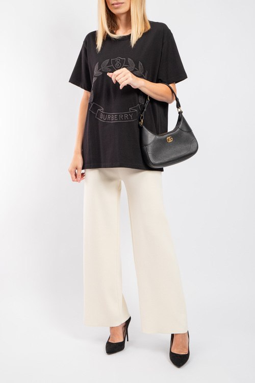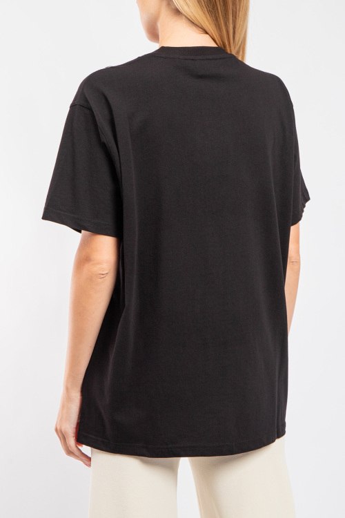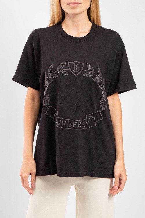 Женская черная хлопковая футболка от Burberry (Бёрберри). Фасон oversize, вышитый логотип на груди, круглый вырез горловины, короткий рукав, удлиненная длина.