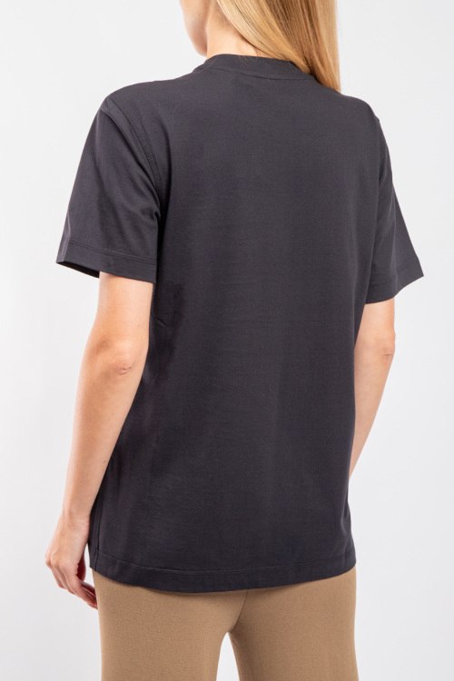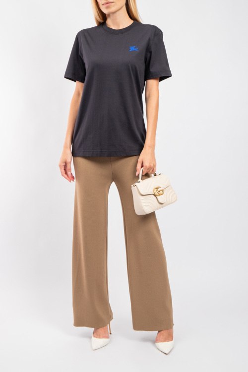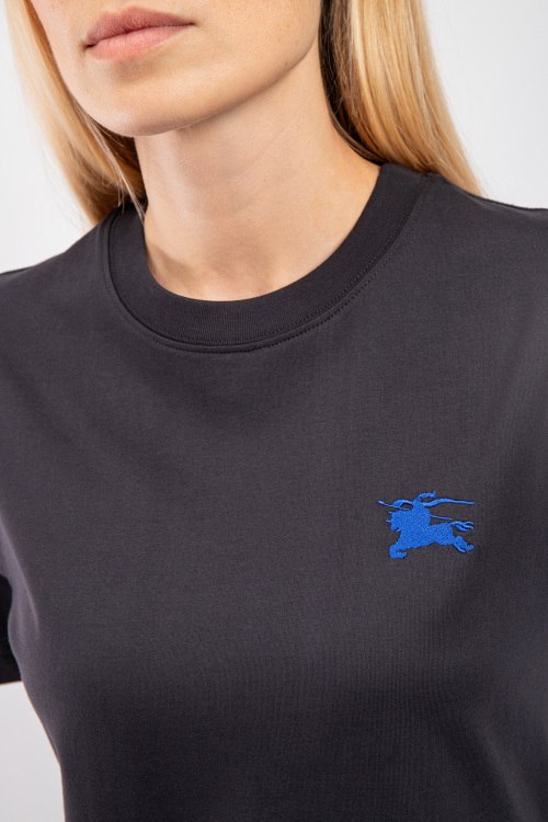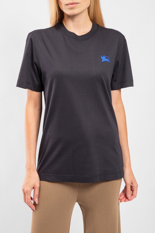 Женская черная хлопковая футболка от Burberry (Бёрберри). Брендовая вышивка EKD на груди, круглый вырез горловины, короткий рукав, классическая длина.