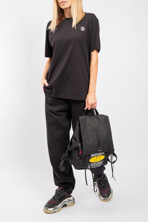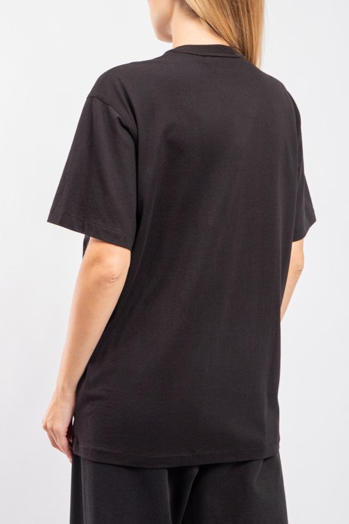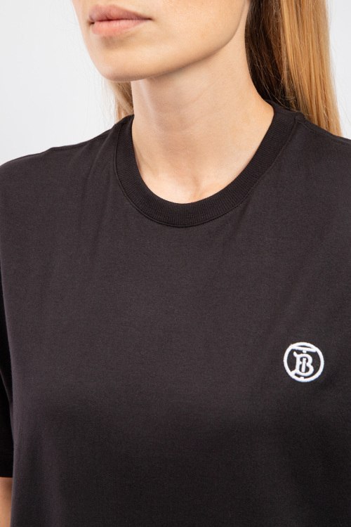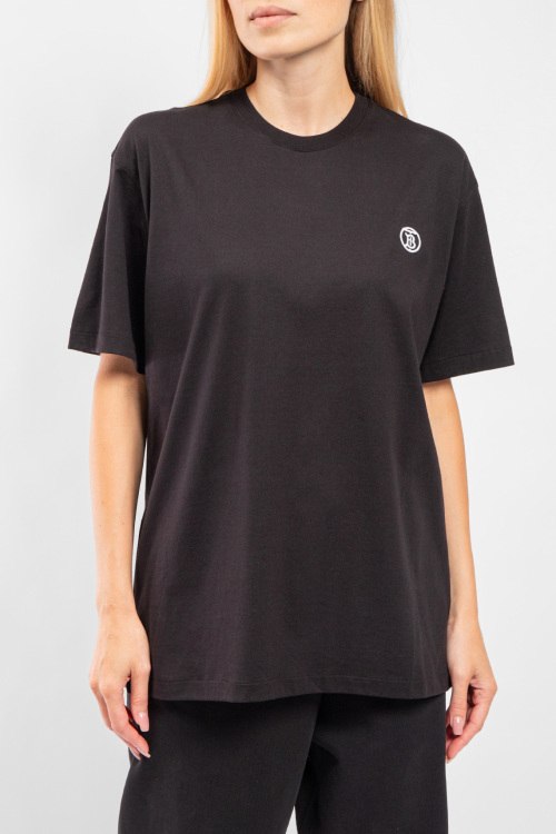 Женская черная хлопковая футболка от Burberry (Бёрберри). Фасон oversize, логотип на груди, круглый вырез горловины, короткий рукав, удлиненная длина.