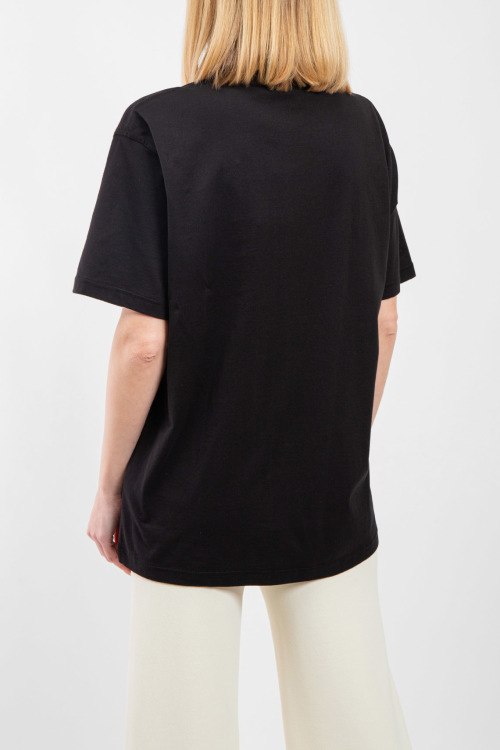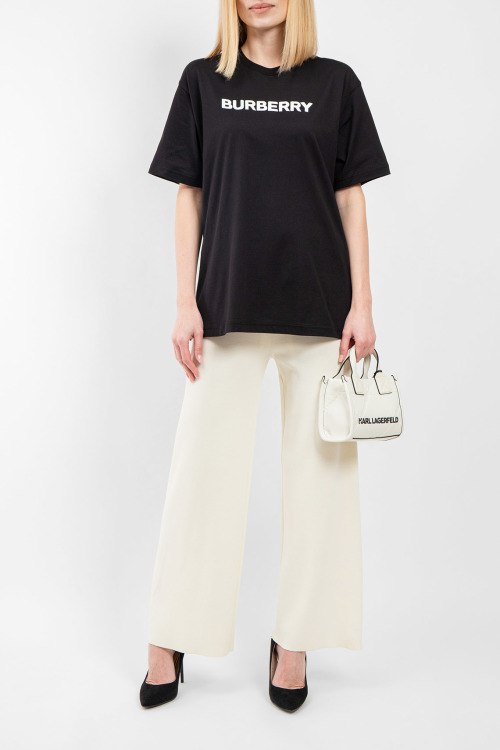 Женская черная хлопковая футболка от Burberry (Бёрберри). Принт с логотипом на груди, круглый вырез горловины, короткий рукав, удлиненная длина.