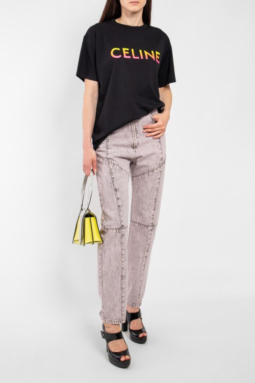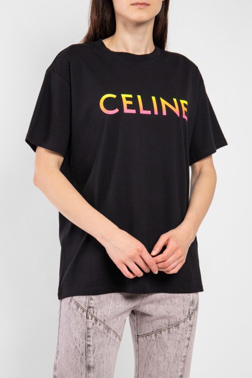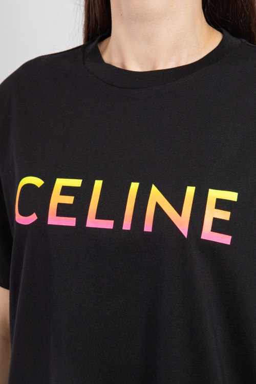 Черная хлопковая футболка унисекс от Celine (Селин). Фасон oversize, принт с логотипом на груди, круглый вырез горловины, короткий рукав, удлиненная длина.