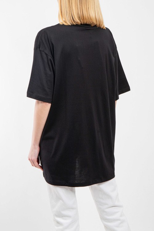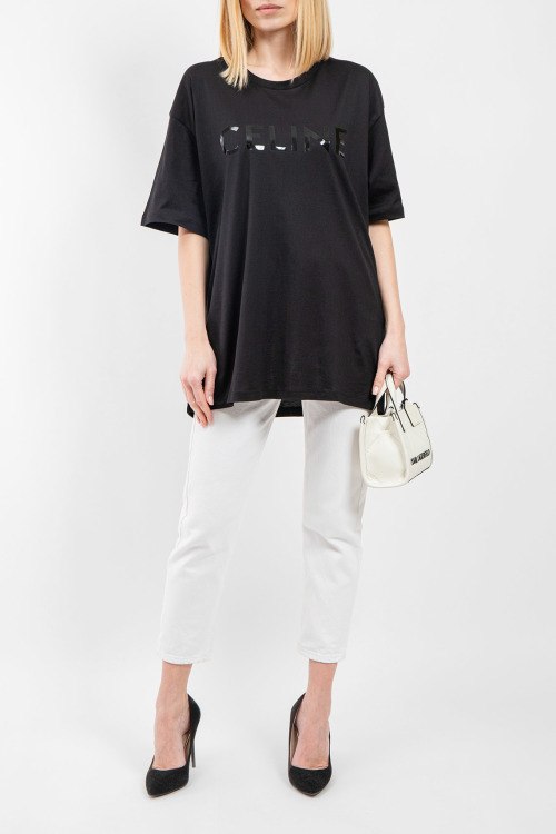 Женская черная хлопковая футболка от Celine (Селин). Логотип на груди, фасон oversize, круглый вырез горловины, короткий рукав, удлиненная длина.