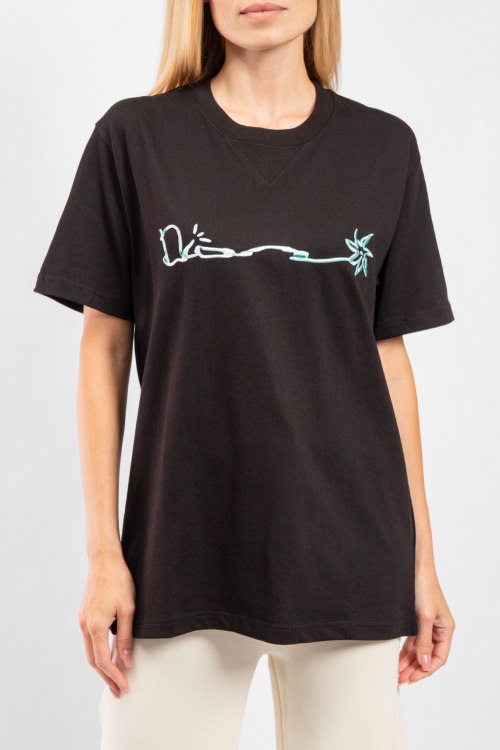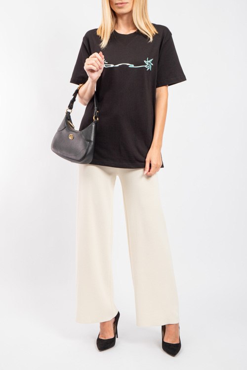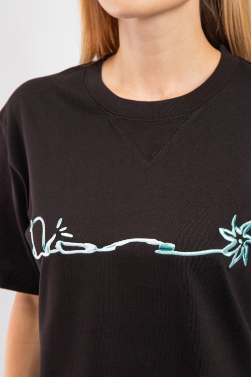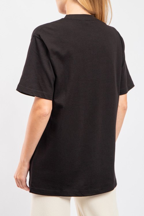 Женская черная хлопковая футболка от Christian Dior (Кристиан Диор). Фасон oversize, вышивка на груди, круглый вырез горловины, короткий рукав, удлиненная длина.