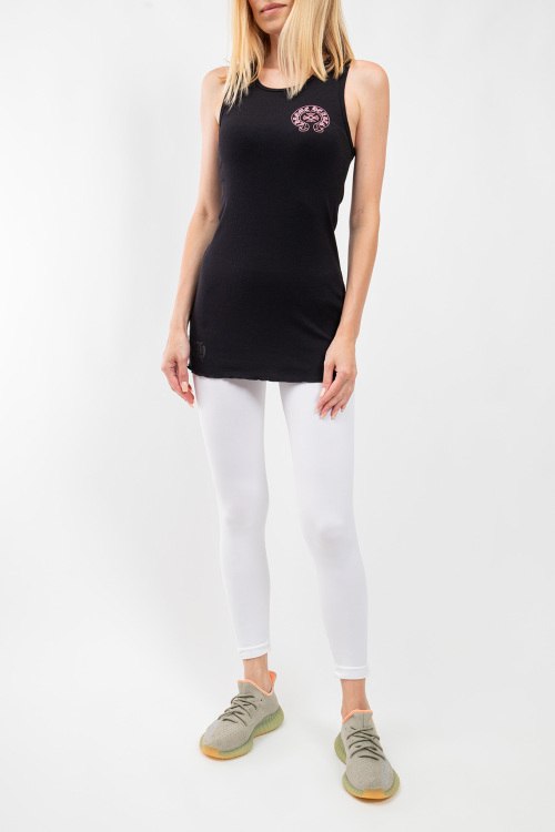 Женская черная хлопковая майка от Chrome Hearts (Хром Хартс). Модель без рукавов, дизайн в рубчик, вышитый логотип спереди и сзади, удлиненная длина.