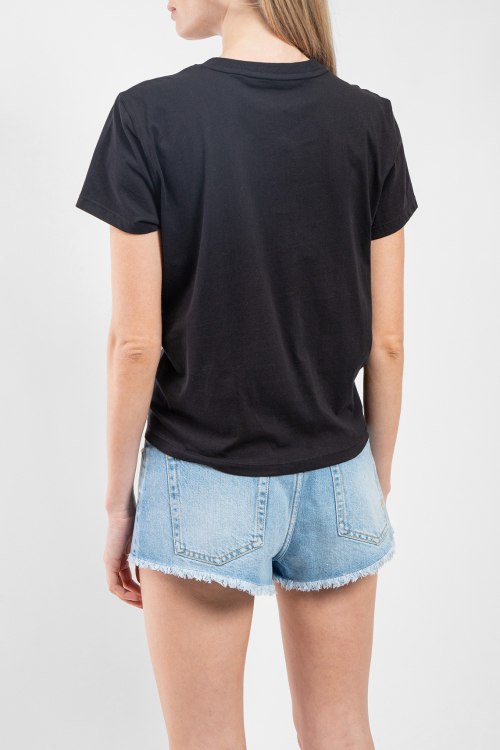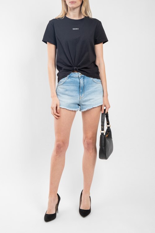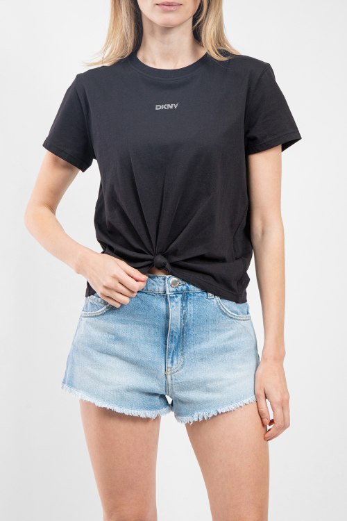 Женская черная хлопковая футболка от Donna Karan (Донна Каран). Логотип на груди, круглый вырез горловины, короткий рукав, нижний край с узлом, классическая длина.