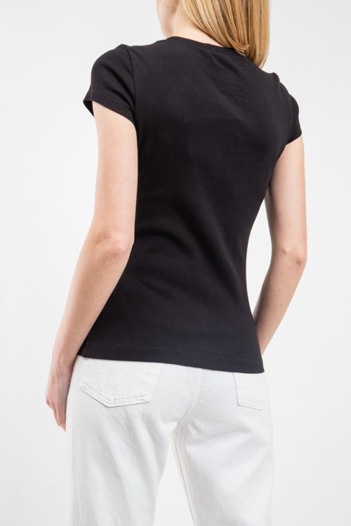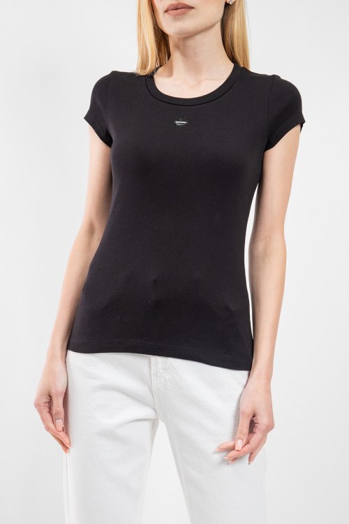 Женская черная хлопковая футболка от Dsquared2 (Дискваред). Логотип на груди, круглый вырез горловины, короткий рукав, классическая длина.
