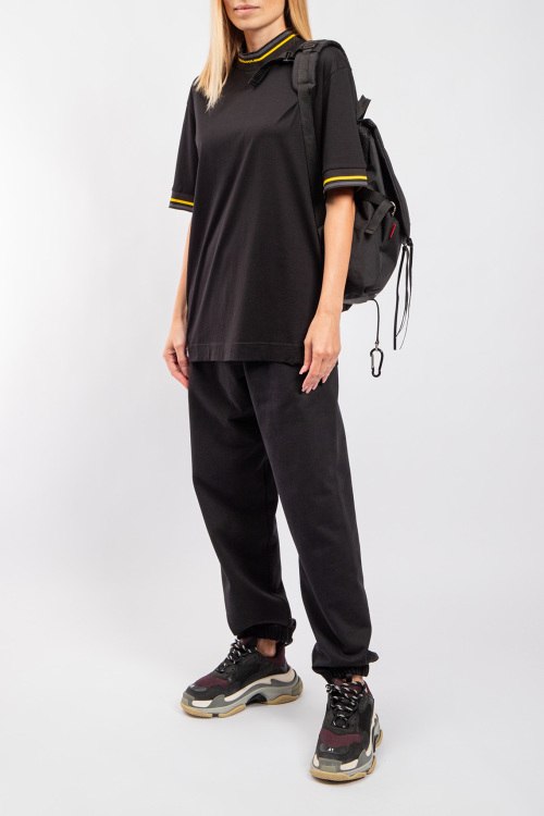 Черная хлопковая футболка унисекс от Fendi (Фенди). Фасон oversize, воротник-стойка с логотипом, короткий рукав с эластичными манжетами, удлиненная длина