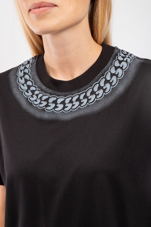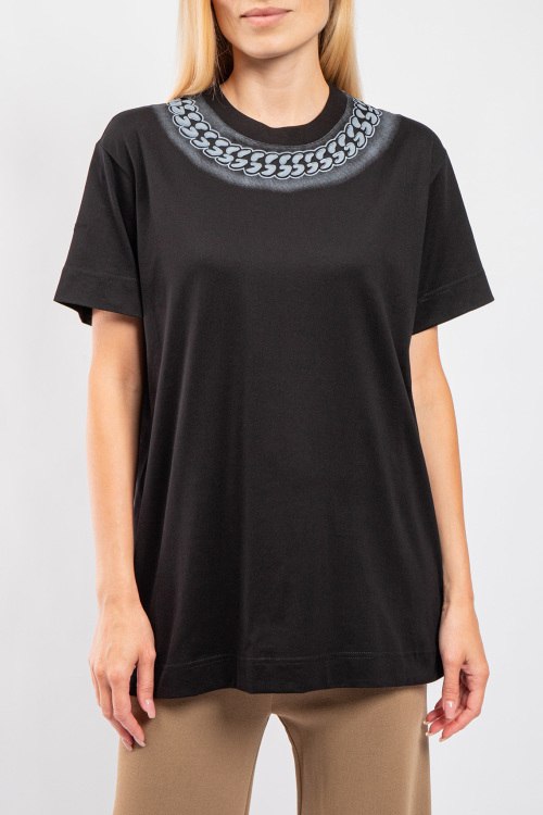 Женская черная хлопковая футболка от Givenchy (Живанши). Фасон oversize, круглый вырез горловины с принтом в виде цепи, короткий рукав, удлиненная длина.