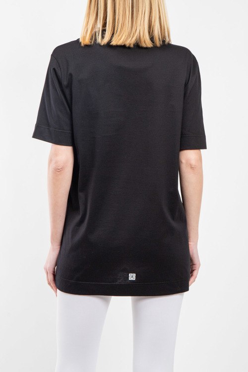 Женская черная футболка из хлопка от Givenchy (Живанши). Удлиненная модель, круглый вырез горловины, короткие рукава, вышитый логотип бренда на груди. Замеры для размера на фото: S; длина - 73 см; ПОГ - 52 см; ПОТ - 51 см; ПОБ - 51 см; длина по внутреннему шву рукава - 10 см; ширина рукава - 18 см.