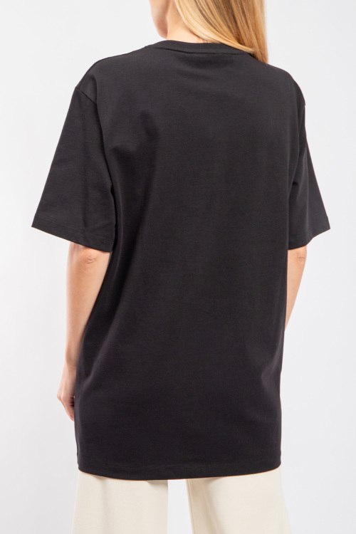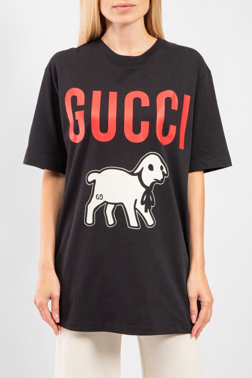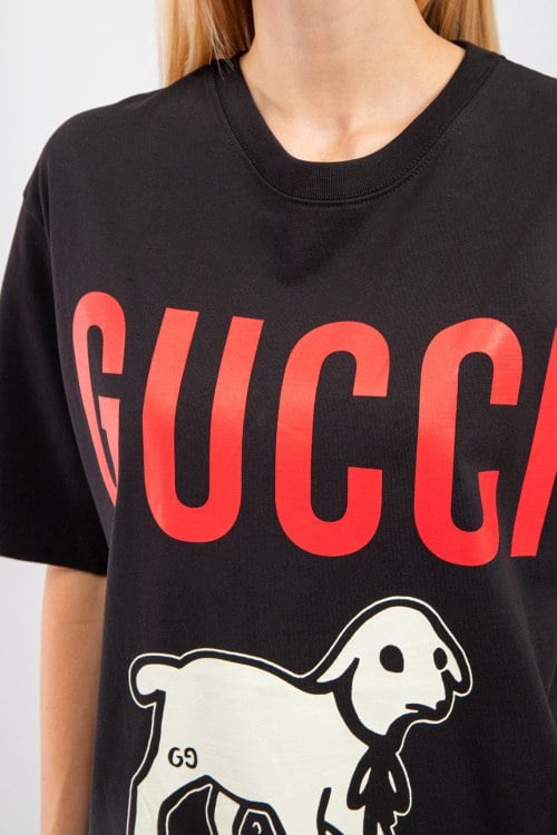 Женская черная хлопковая футболка Lamb от Gucci (Гуччи). Фасон oversize, логотип на груди, круглый вырез горловины, короткий рукав, удлиненная длина.