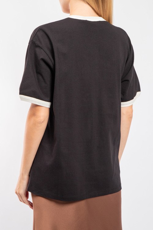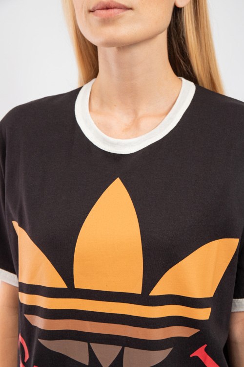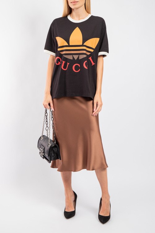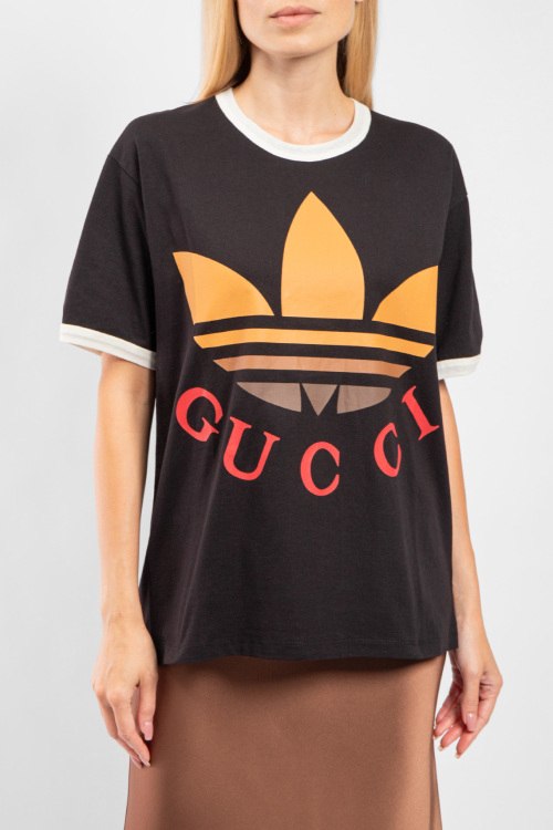 Женская черная хлопковая футболка Gucci х Adidas от Gucci (Гуччи). Фасон oversize, логотип на груди, круглый вырез горловины, короткий рукав, удлиненная длина.