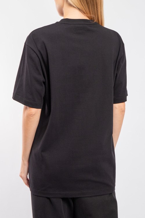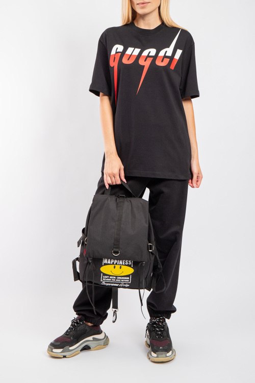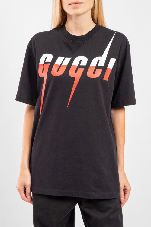 Женская счрная хлопковая футболка Gucci Blade от Gucci (Гуччи). Фасон oversize, логотип на груди, круглый вырез горловины, короткий рукав, удлиненная длина.