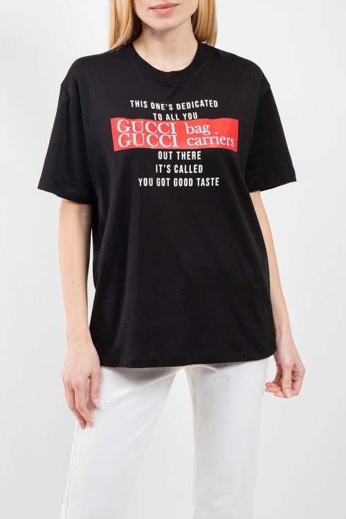 Женская черная хлопковая футболка You Got Good Taste от Gucci (Гуччи). Принт с логотипом и надписями на груди, круглый вырез горловины, короткий рукав, классическая длина.