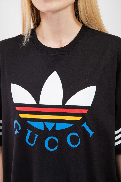 Женская черная хлопковая футболка Gucci x Аdidas от Gucci (Гуччи). Принт с логотипом на груди и на спине, фасон oversize, круглый вырез горловины, короткий рукав с белыми полосками, удлиненная длина.