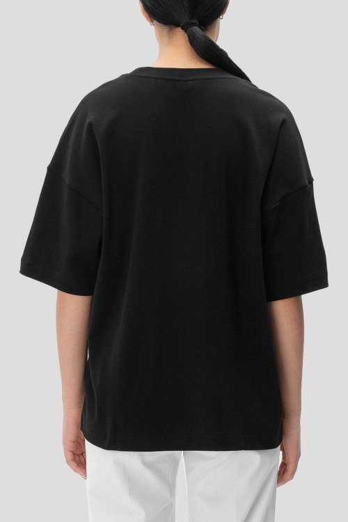 Детали: Женская черная футболка Easie из хлопка от Hugo Boss (Хуго Босс). Круглый вырез горловины, приспущенная линия плеча, короткие рукава, украшена декором спереди, логотип бренда