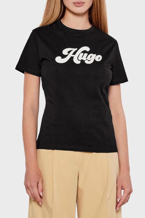 Детали: Женская черная хлопковая футболка Damacia от Hugo by Hugo Boss (Хуго бай Хуго Босс). Логотип на груди, круглый вырез горловины, короткий рукав, классическая длина