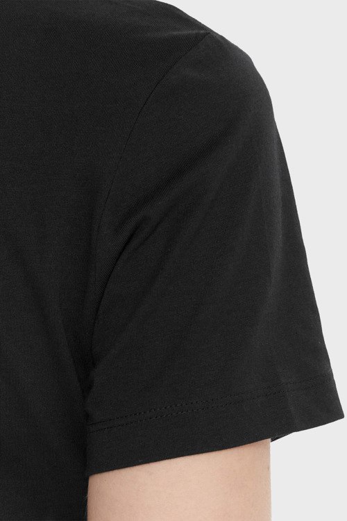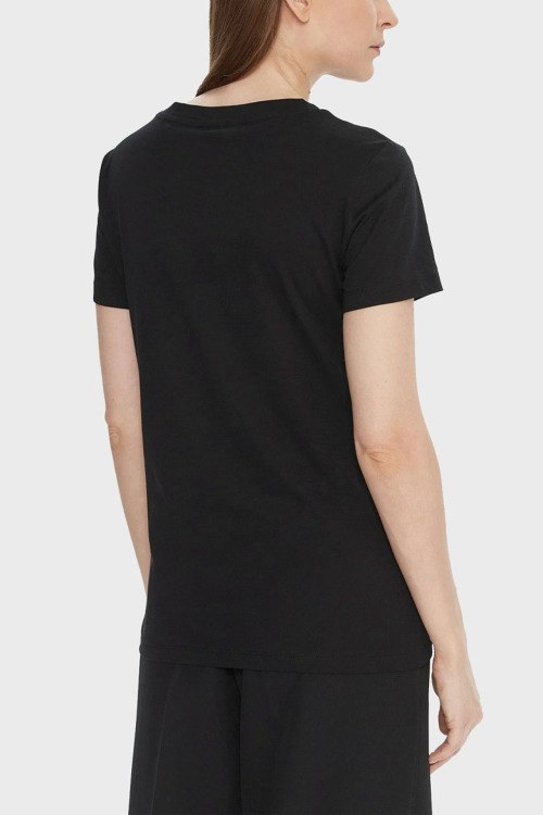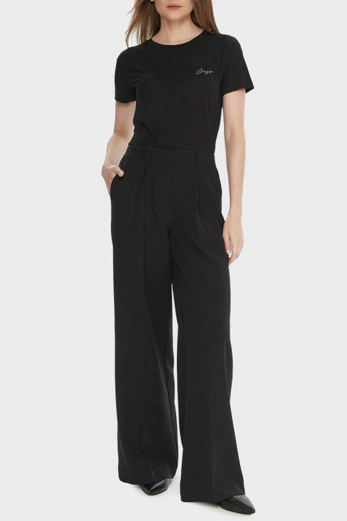 Детали: Женская черная хлопковая футболка Esogo от Hugo Boss (Хуго Босс). Логотип из кристаллов на груди, круглый вырез горловины, короткий рукав, классическая длина