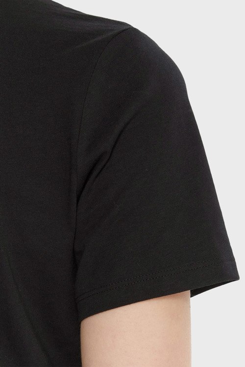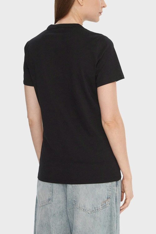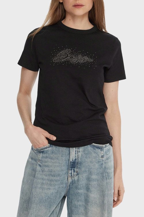 Детали: Женская черная хлопковая футболка Elogo от Hugo Boss (Хуго Босс). Логотип из кристаллов на груди, круглый вырез горловины, короткий рукав, классическая длина