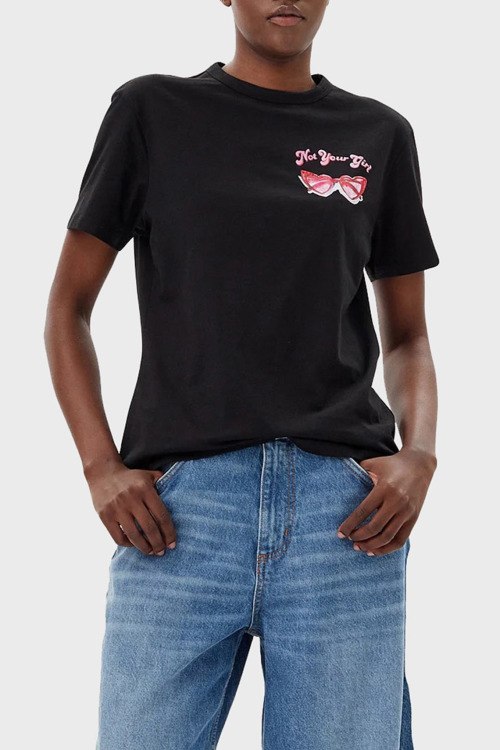 Детали: Женская черная хлопковая футболка Damacia от Hugo by Hugo Boss (Хуго бай Хуго Босс). Принт на груди, круглый вырез горловины, короткий рукав, классическая длина