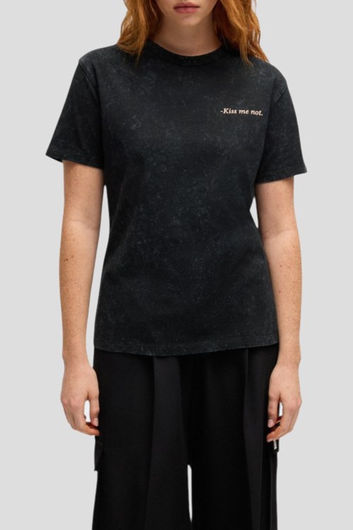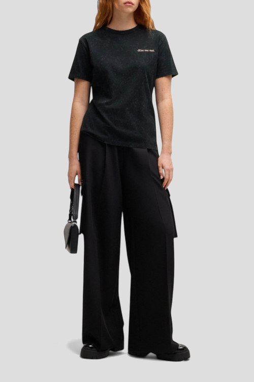 Детали: Женская черная футболка Damacia_3 из хлопка от Hugo by Hugo Boss (Хуго бай Хуго Босс). Классическая длина, круглый вырез горловины, короткие рукава, надпись на груди